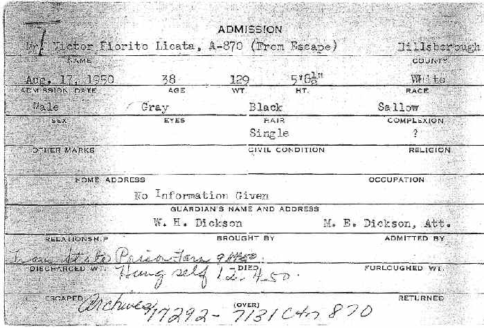 Poor Kid, even in his later life, he just didn’t photograph very well. =========== FOOTNOTES: [9A]— Note, it is believed that the final Lunacy Commission made an oral as opposed to a written court report, (thus no written records exist), however, we do have newspaper accounts of what was said. [9B]- Tampa Times (Oct 31, 1933 p1) “Report Shows Ax Slayer of Family Insane” [9C]- Tampa Times (Nov 2, 1933p5) “ALIENIST SAYS LICATA INSANE “ VICTOR LICATA - A RUSH TO JUDGEMENT WANT TO KNOW MORE: ===================== Due to space / download time considerations, only selected materials are displayed. If you would like to obtain more information, feel free to contact the museum. All our material is available (at cost) on CD-Rom format. Please contact: antique_andy@catholic.org