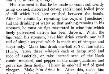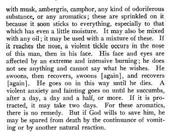 Also, in this category, there is an Indian hemp in the region of Mesopotamia and in Mosul. Its leaf resembles the form of the endive, or just slightly smaller. When it is uprooted and thrown into stagnant water, it causes all the fish in the water, it causes so that the fish rise to the surface to be taken by hand. It is necessary to uproot this hemp while Taurus is ascendant and also throw it into water in that period. ---- The Book of Poisons by Ibn Wahshtya ; Transactions American Philosophical Society 1966 Vol.56 No. 7: pg 27-28 On the Treatment for Drinking Blood of the Bull, Fresh or Not If a man drinks one Mithqal of this blood at the time of the slaughtering of the bull, then he will die in from six to eight hours. . . . His treatment is that he be made to vomit sufficiently using oxymel, macerated cut-up radish, and boiled juice of dill which had been crushed between the hands. After he vomits by repeating the oxymel [medicine] and the drinking of water so that nothing remains in his stomach, he must eat figs macerated in ivine into which finely pulverized natron has been thrown. When the figs reach his stomach, have him drink exactly one half ratl of simple oxymel which is made up of vinegar and sugar only. Make him drink one-half rail of rainwater. Hurry. Take three mitlzqdls each of hemp seed and root of asafetida, or take instead seed of the black cumin, mustard, and pepper in the same quantities and pulverize them finely. . . . . ---- The Book of Poisons by Ibn Wahshtya ; Transactions American Philosophical Society 1966 Vol.56 No. 7: pg 80 d. LETHAL SCENTS “Antidotes to lethal oils by sniffing. Hellebore, mandrake, R. asiaticus. Hashish mixture, salah mixture, black-cow-flesh mixture, winter-cherry mixture on a wood fire, storax mixture on fire wood, "blue sulfur" mixture, ox-blood mixture, opoponax and asafetida mixture, various mixtures of animal origin.” --- The Book of Poisons by Ibn Wahshtya ; Transactions American Philosophical Society 1966 Vol.56 No. 7: pg 11