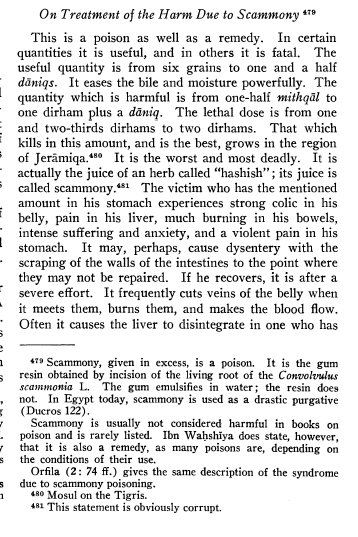 Description of Another Poison Which Is Fatal Because of a Stench, Aromatic and Other Kinds of Odors: Hashish which grows on the borders of the country of Bgjarmg is taken. In Nabatean, it is called shartdthd, Description: It grows in austere places where there is neither water nor moisture. Its leaf is like the leaf of the caper tree; its stem is round and has yellowness in it. The tallest of them is a cubit. Its characteristic is that it always seems to be in motion even if there is not a breeze in the air. If the wind blows, it is set into a continuous motion. If there be no wind, it is in a slight motion and swings, little by little. Its odor is like that of the caper and often lighter than it. Some of it is taken, pulverized, and then water drawn from a very deep well is sprinkled on it. Its liquid is then squeezed out and it is very well exhausted. Then a slice of the green bulb of the narcissus is well dried in the sun, pulverized, and moistened with the extract obtained from the hashish. Indeed, a curious thing arises when they are mixed. It is that they become a lethal poison whereas, as simples, they have no effect. The moistening is continued, then dried, so that three times its amount must be absorbed of the hashish extract. Then it is buried in a black lead vessel which is in the shape of a casket with its cover. It remains in its stink for fourteen days; the moon must be with Mars when it is buried. It is then taken out. It must be moist with the extract which you admixed when it was buried. After it is taken out, it is dried well in the sun in the lead vessel. When its drying is completed, it must be pulverized together with the bones of any dead animal in the lead vessel so that it becomes a dust. This is made possible by pulverizing little by little, continuously, and softening very well. Then this is mixed with musk, ambergris, camphor, any kind of odoriferous substance, or any aromatics; these are sprinkled on it because it soon sticks to everything, especially to that which has even a little moisture. It may also be mixed with any oil ;it may be used with a mixture of these. If it reaches the nose, a violent tickle occurs in the nose of this man, then in his face. His face and eyes are affected by an extreme and intensive burning; he does not see anything and cannot say what he wishes. He swoons, then recovers, swoons [again], and recovers [again]. He goes on in this way until he dies. A violent anxiety and fainting goes on until he succumbs, after a day, a day and a half, or more. If it is protracted, it may take two days. For these aromatics, there is no remedy. But if God wills to save him, he may be spared from death by the continuance of vomiting or by another natural reaction. ---- The Book of Poisons by Ibn Wahshtya ; Transactions American Philosophical Society 1966 Vol.56 No. 7: pg 43 On Treatment of the Harm Due to Scammony This is a poison as well as a remedy. In certain quantities it is useful, and in others it is fatal. The useful quantity is from six grains to one and a half dnftiqs. It eases the bile and moisture powerfully. The quantity which is harmful is from one-half mithqdl to one dirham plus a ddniq. The lethal dose is from one and two-thirds dirhams to two dirhams. That which kills in this amount, and is the best, grows in the region of Jeramiqa. It is It is the worst and most deadly, actually the juice of an herb called "hashish" ; its juice is called scammony. The victim who has the mentioned amount in his stomach experiences strong colic in his belly, pain in his liver, much burning in his bowels, intense suffering and anxiety, and a violent pain in his stomach. It may, perhaps, cause dysentery with the scraping of the walls of the intestines to the point where they may not be repaired. If he recovers, it is after a severe effort. It frequently cuts veins of the belly when it meets them, burns them, and makes the blood flow. . . . ---- The Book of Poisons by Ibn Wahshtya ; Transactions American Philosophical Society 1966 Vol.56 No. 7: pg 93 WANT TO KNOW MORE: ===================== Due to space / download time considerations, only selected materials are displayed. If you would like to obtain more information, feel free to contact the museum. All our material is available (at cost) on CD-Rom format. CONTACT PAGE