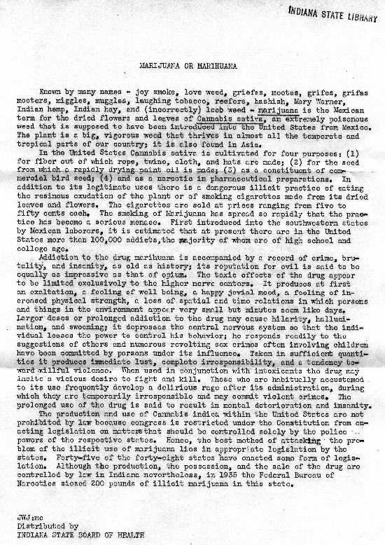 MARIJUANA OR MARIHUANA Known by many names joy smoke, love weed, griefes, mootas, grifes, grifas mooters, miggles, muggles, laughing tobacco, reefers, hashish, Mary Warner, Indian hemp, Indian hay, and (incorrectly) loco weed - marijuana is the Mexican term for the dried flowers and leaves of Cannabis sativa, an extremely poisonous weed that is supposed to have been introduced into the United States from Mexico. The plant is a big, vigorous weed that thrives in almost all the temperate and tropical parts of our country; it is also found in Asia. In the United States Cannabis sativa is cultivated for four purposes (1) for fiber out of which rope, twine, cloth, and hats are made; (2) for the seed from which a rapidly drying paint oil is made; (3) as a constituent of commercial bird seed; (4) and as a narcotic in pharmaceutical preparations. In addition to its legitimate uses there is a dangerous illicit practice of eating the resinous exudation of the plant or of smoking cigarettes made from its dried leaves and flowers. The cigarettes are sold at prices ranging from five to fifty cents each. The smoking of Marijuana has spread so rapidly that the practice has become a serious menace. First introduced into the southwestern states by Mexican laborers, it is estimated that at present there are in the United States more than 100,000 addict, the majority of whom are of high school and college age. Addiction to the drug marihuana is accompanied by a record of crime, brutality, and insanity, as old as history; its reputation for evil is said to be equally as impressive as that of opium. The toxic effects of the drug appear to be limited exclusively to the higher nerve centers. It produces at first an exaltation, a feeling of well being, a happy jovial mood, a fooling of increased physical strength, a loss of spatial and time relations in which persons and things in the environment appear very small but minutes seem like days. Larger doses or prolonged addiction to the drug may cause hilarity, hallucination, and swooning; it depresses the central nervous system so that the individual looses the power to control his behavior; he responds readily to the suggestions of others and numerous revolting sex crimes often involving children have been committed by persons under its influence. Taken in sufficient quantities it produces immediate lust, complete irresponsibility, and a tendency toward willful violence. When used in conjunction with intoxicants the drug may incite a vicious desire to fight and kill. Those who arc habitually accustomed to its use frequently develop a delirious rage after its administration, during which they are temporarily irresponsible and may commit violent crimes. The prolonged use of the drug is said to result in mental deterioration and insanity. The production and use of Cannabis indica within the United States are not prohibited by law because congress is restricted under the Constitution from enacting legislation on matters that should be controlled solely by the police, powers of the respective states. Hence, the best method of attacking the problem of the illicit use of marijuana lies in appropriate legislation by the states. Forty-five of the forty-eight states have enacted some form of legislation. Although the production, the possession, and the sale of the drug are controlled by law in Indian, nevertheless, in 1935 the Federal Bureau of Narcotics sized 200 pounds of illicit marijuana in this state. JWJ:me Distributed by INDIANA STATE BOARD OF HEALTH WANT TO KNOW MORE: ===================== Due to space / download time considerations, only selected materials are displayed. If you would like to obtain more information, feel free to contact the museum. All our material is available (at cost) on CD-Rom format. CONTACT PAGE
