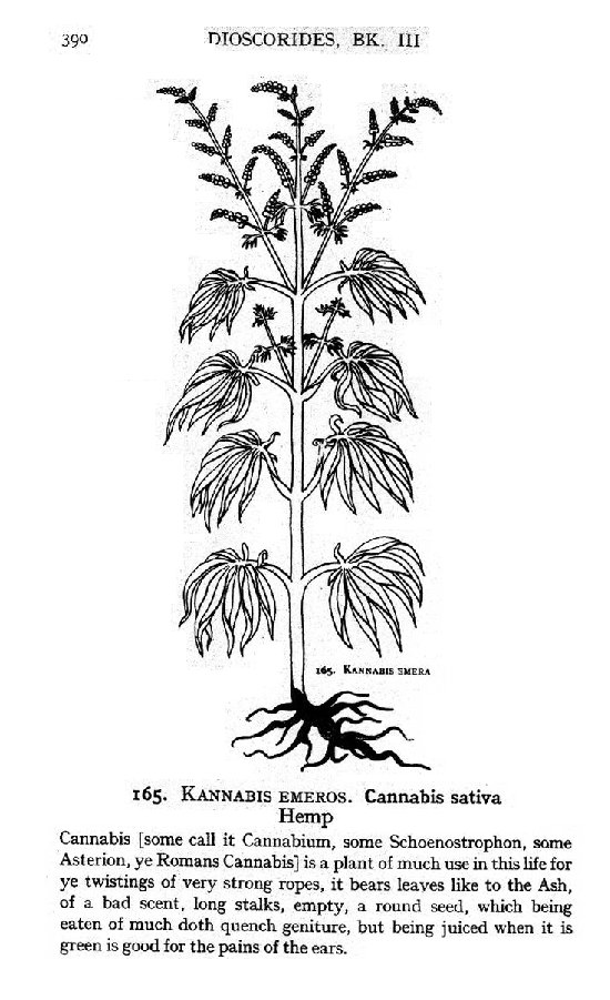 Dioscorides, is most noted for his set of Botanical/Medical Books, “De Materia Medica,” which clearly make references to the Medical Cannabis Plant. Although of Greek origin, he served and travelled with Roman armies throughout the empire, collecting what medical knowledge he could, everywhere he went. In the “De Materia Medica” he documents almost the complete knowledge of Roman Medicine, listing almost 600 medical plants and minerals, as well as giving over 900 remedies various health problems. While much of what he wrote, was (how shall we say it) somewhat incorrect, still his works were still in medical use throughout Europe until the mid-16th Century. In later times, his texts (containing numerous illustrates) were translated into numerous languages, including Latin, Arabic, Italian, French, Spanish, English, German, Persian etc. Dioscorides wrote in Book III of the "Materia Medica” “Kannabis; is a plant of much use in this life for the twisting of very strong ropes, it has leaves like to the Ash, of a bad scent, long stalks, empty, a round seed, which being eaten of reduces sexual activity, but being juiced when it is green is good for the pains of the ears.”And while it seems that he was only familiar with the medical uses of its seeds, still the fact is that Dioscorides was one of the first Western writers to talk about the plants medical uses. ![]()