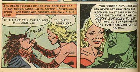![]() GANGSTERS AND GUN MOLLS #3 DATE: March 1952 STORY TITLE: "Janita Perez - the Gypsy Killer" STORY PLOT: Not a reefer madness story. Marihuana is only mentioned once and then only under the word Weed, In "Janita Perez - the gypsy killer." The story seems to be about a bad girl who started early and committed every kind of crime possible. Even running a dope ring. In one of the scene(s) she says " You wanted out -- But your can never get away from the WEED habit. -- It eats into you--You've got to have it!" -- Not worth reading. FOOTNOTES: [1]- Not a reefer madness story. Publisher: Avon Periodical/Realistic Comics WANT TO KNOW MORE: ===================== To the best of our knowledge, all reproductions are legal and well within the keepings of the fair use doctoring. Please contact us if you feel if you feel that your material is being illegally used. Due to space / download time considerations, only selected materials are displayed. If you would like to obtain more information, feel free to contact the museum. All our material is available (at cost) on CD-Rom format.