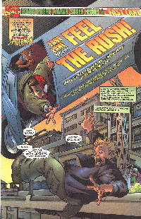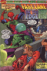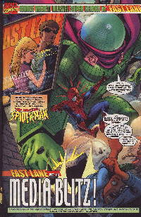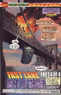 Fast Lane #1: "Media Blitz!" Spider-Man defends himself from yet another attack by the special effects guru turned criminal, Mysterio. The fight ends quickly when the wall-crawler realizes he is not actually dealing with the villain but his cameras and simulations. Peter Parker doesn’t have time to investigate; he is late for another assignment at the Daily Bugle. He will be working with college interns Sam Exmore and Toni Harris as they try to get a story for the newspaper’s teen supplement, “On Target”. J. Jonah Jameson refuses to run ads for a new movie in which the star, Zane Whelan, seems to condone (if not promote) marijuana use. J.J.J. storms off after Toni reminds him that the advertisements pay for the paper. Sam idolizes Zane Whelan and leads the news team to an interview the interns arranged with the actor. As they drive across town, however, Mysterio strikes. Spider-Man’s foe uses a large crane and magnet to lift the vehicle off a bridge and dangle it precariously over the river. Sam falls out the driver’s side door, and the only way Peter can save him will reveal his secret identity.[2] Fast Lane #2: "Feel the Rush!" Sam Exmore falls out of the news van suspended in the air by Mysterio’s large magnet. Peter Parker quickly and secretly snags the airborn intern with webbing. He aims for the trap’s controls and manages to release their vehicle from the super-villian. Peter and the two young reporters race safely away. The three reach Zane Whelan’s video shoot in time to see a dangerous stunt in which the singer jumps off a building while high on drugs. Toni Harris tries to convince Sam that maybe his idol is phony. Sam scoffs at the notion and follows his hero only to overhear some disturbing news. Zane simply portrays an image of drug-use to appeal to the youth market. Sam leaves in disgust. He jumps into the van, smokes some of his drugs and drives off. Mysterio attacks at that moment preventing Spider-Man from stopping the speeding van.[2] Fast Lane #3: "On the Edge" Spider-Man defeats Mysterio; Sam drives the Daily Bugle van under the influence of marijuana, and is knocked off the Brooklyn Bridge; Spider-Man grabs the van with a webline at the last second, and holds on with all his strength[2] Fast Lane #4: "Back on Target" Spider-Man tries to stop the Daily Bugle van from falling into the river, and is assisted by numerous Marvel heroes; Sam learns his lesson about the dangers of marijuana.[2] Fast Lane is a four part anti-drug story [paid for by the narc's] inserted with numerous Marvel comicbook titles [see list below] between 1999 and 2000:
