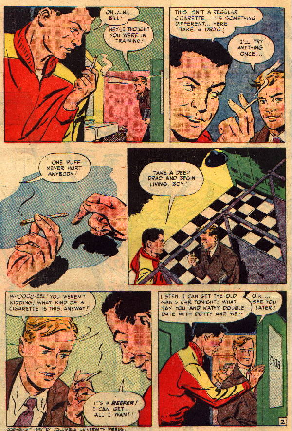 TRAPPED #1 DATE: 1951 STORY TITLE: "Trapped" STORY PLOT: Anti-Medical Marihuana, anti-Drug education comic. Prepared by "the Committee on Narcotics - N.Y City," and distributed at public schools. - Bill Jones, a clean-cut, high-school kid, is conned (in the boys restroom) into trying Marihuana. It's all downhill for him after that. His schoolwork suffers, he gets into fights with his parents, etc. And while his girlfriend, teachers, etc., try to help, soon he moves on to hard drugs. (Medical Marihuana = starter drug - everyone knows that.) Only after he is arrested and put in jail does he come to his senses. A must read. FOOTNOTES: [1]- Five star reefer madness rating. Publisher Publisher: Columbia University Press WANT TO KNOW MORE: ===================== To the best of our knowledge, all reproductions are legal and well within the keepings of the fair use doctoring. Please contact us if you feel if you feel that your material is being illegally used. Due to space / download time considerations, only selected materials are displayed. If you would like to obtain more information, feel free to contact the museum. All our material is available (at cost) on CD-Rom format.